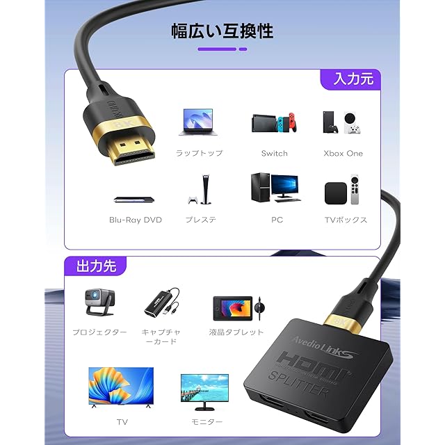 商品名:avedio links 8K@60Hz HDMI 分配器 1入力2出力 4K@120Hz HDMI 2.1 分配器 同時出力 EDID/HDCP2.3/VRR/ALLM/48Gbps/3D/Dolby Vision対応 【1.2mの8Kケーブル付き】