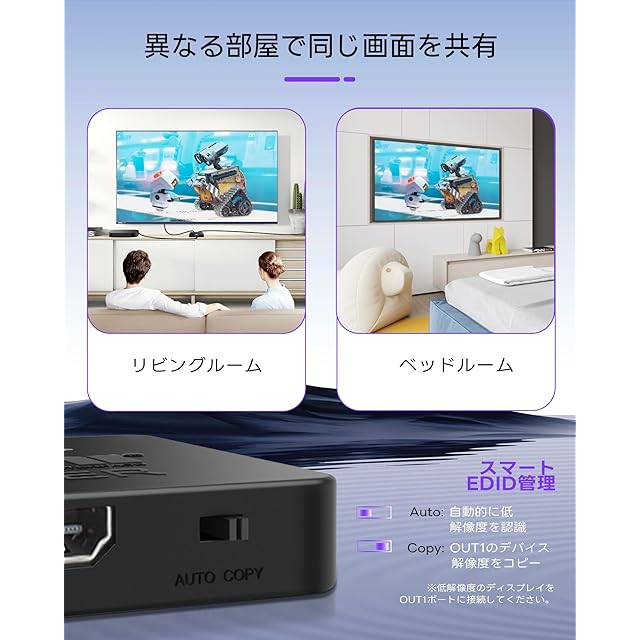 【EDID管理機能搭載】自動モードとコピーモードの2種類を搭載。自動モードでは低い解像度のディスプレイに適応し、コピーモードでは出力1の解像度を適用。最適な画質で使用可能。