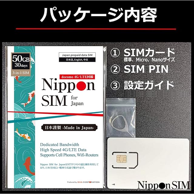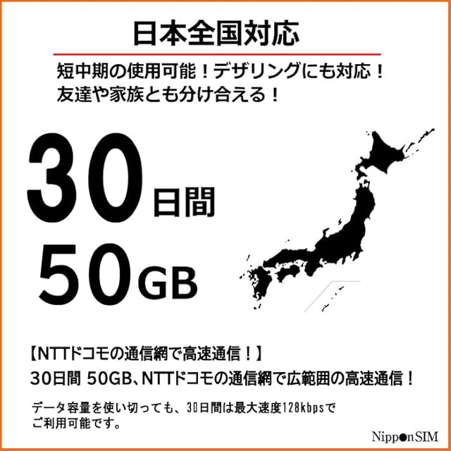 【NTTドコモの通信網で高速通信!】 30日間 50GB、NTTドコモの通信網で広範囲の高速通信!ご購入のデータ容量を使い切っても、30日間は最大速度128kbpsでご利用可能です。【対応SIMサイズ】 標準、Micro、nano サイズ切り替え可能 【製品パッケージ】SIM カード/SIMピン/多言語マニュアル(日本語・英語・中国語)。