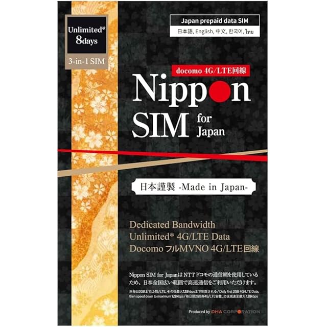 商品名:プリペイドsim 日本 8日間 無制限 (毎日2GBは高速、超えると当日最大128kbps) simカード simピン付 | データ通信専用 | 3in1 (標準/マイクロ/ナノ)対応 | ドコモ docomo 4G/LTE回線 | Wifiルーター対応 | デザリング可 | simフリー端末のみ対応 | 多言語マニュアル付