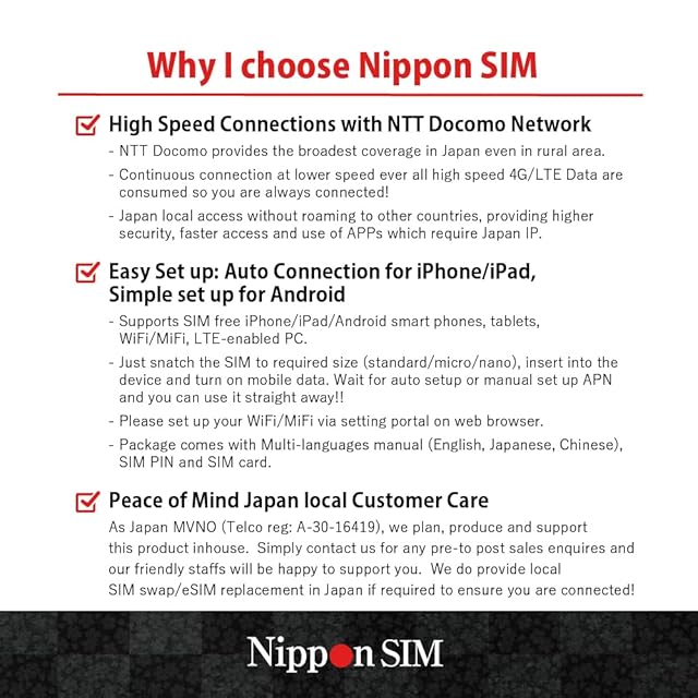 【面倒な契約なし!サポートも充実】個人認証、クレジットカード登録、契約、事務手数料等は一切不要です。株式会社DHA Corporationは日本のMVNO(仮想移動体通信事業者、届出番号A-30-16419)です。販売からサポートまでを一貫して提供しており、日本語/英語/中国語でのサポートを行っております。商品や設定方法などについてわからないことがございましたら遠慮なくご連絡ください。