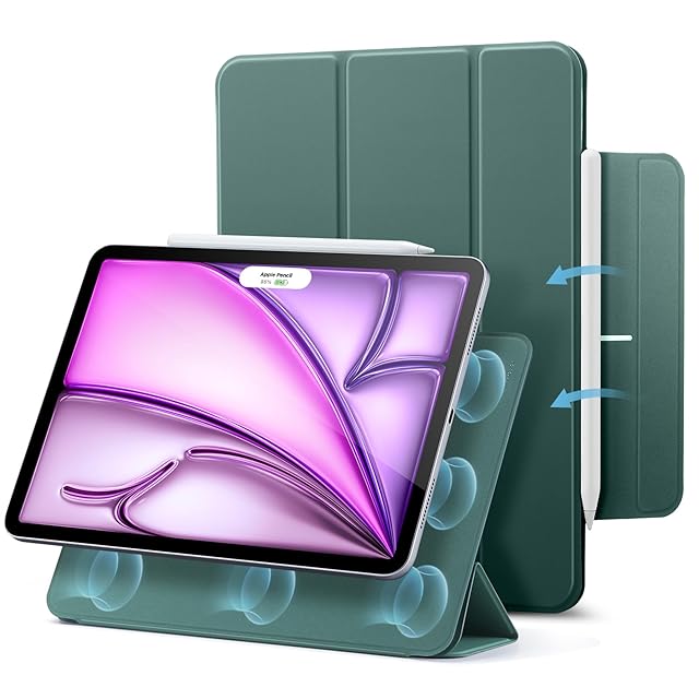 ESR iPad Air 13インチ ケース (M3/M2、2025/2024) iPad Pro 12.9 ケース 第6/5/4世代(2022/2021/2020) 強力マグネット吸着式 スリムな三つ折りスタンドケース Pencil Pro/USB-C完全対応 自動ウェイク/スリープ 耐久性保護 Reboundシリーズ グリーン