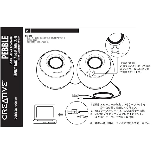 商品名:Creative Pebble ブラック【価格.com プロダクトアワード2024】音声入力 ピンプラグ/電源 USB 接続 / 45度 上向きスピーカー 低音パッシブラジエーター 搭載 ピーク出力8.8W/総合4.4W RMS PC スピーカー SP-PBL-BK