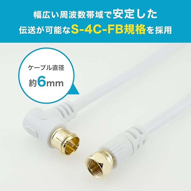 ●ケーブル規格:S-4C-FB ●コネクタ規格:F型 ●コネクタ形状:L字差込式-ネジ式(金メッキ仕様) ●コネクタサイズ ・L字差込式:W約14.8 x H約14.4 x D約30.2 mm ・ネジ式:W約12.5 x H約12.5 x D約32.75 mm ●インピーダンス:75Ω ●ケーブル直径:6mm