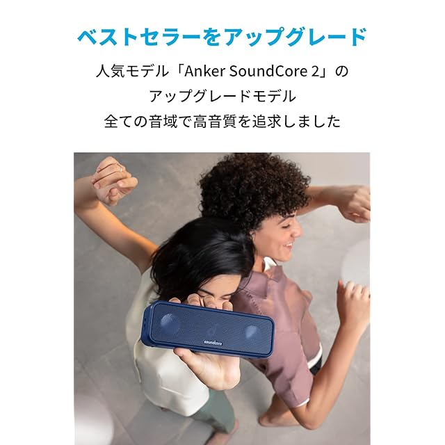 進化した音響体験:Anker SoundCore 2から一段と進化した音質で、クリアなオーディオと深みのある低音を提供します。そのコンパクトなサイズからは予想できないほどの高音質を実現。