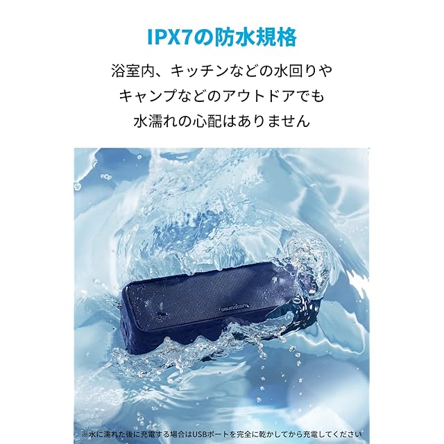 Soundcore | Hear It. Feel It.<br> 「Soundcore」は、Ankerで培ったノウハウやバッテリー技術を受け継ぎながら、最先端のオーディオテクノロジーを駆使し、こだわりの音の体験を提供するオーディオブランドです。<br><br> 主な製品仕様<br>サイズ:約174×57×59 mm <br> 重量:約500g<br> 防水規格:IPX7(※一時的(30分)に一定水深(1m)の条件に水没しても内部に浸水しないと定義されています。)<br> 通信方式:Bluetooth 5<br> オーディオ出力:16W(8W × 2) <br>再生可能時間:約24時間<br><br> パワフルなステレオサウンド<br>Soundcore 3はコンパクトサイズながら、最大16Wの豊かで鮮明なステレオサウンドを実現し、屋内の使用だけでなく、屋外での使用にも最適です。<br><br> チタニウムドライバー<br>チタニウムドライバーを搭載し、音の歪みを最小限に押さえます。<br><br> 40kHzまでの高域<br>40kHzまでの周波数帯に対応し、クリアな高音を実現。曲の細部まで忠実に再現します。<br><br> BassUpテクノロジー<br>アップグレードされたデジタルシグナルプロセッサを使用し、再生する楽曲をリアルタイムで分析し、低音をより力強く、より鮮明に響かせます。体全体に響くサウンドを体験してください。<br><br> PartyCast機能<br>100以上のSoundcore 3もしくはPartyCastスピーカーとペアリングして、深みと広がりのある大音量ステレオサウンドを簡単に実現できます。<br> <br> Soundcoreアプリ対応<br>Soundcoreアプリを使ってイコライザーをカスタマイズし、お気に入りの音楽ジャンルに最適なミックスを作成できます。<br><br>持ち運びに便利<br>Soundcoreアプリを使ってイコライザーをカスタマイズし、お気に入りの音楽ジャンルに最適なミックスを作成できます。<br><br>USB-Cポート採用<br>充電ポートにUSB-Cを採用しているため、スマートフォンやノートPCと同じケーブルをご使用いただけます。
