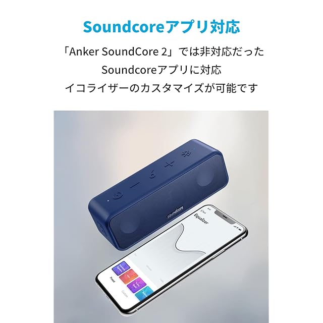 商品名:Anker Soundcore 3 Bluetooth スピーカー/ IPX7 防水/チタニウムドライバー/デュアルパッシブラジエーター/BassUpテクノロジー/アプリ対応/イコライザー設定/USB-C接続/ 24時間連続再生/ PartyCast機能/お風呂で使用可能/プレゼントやギフトに最適/ネイビー