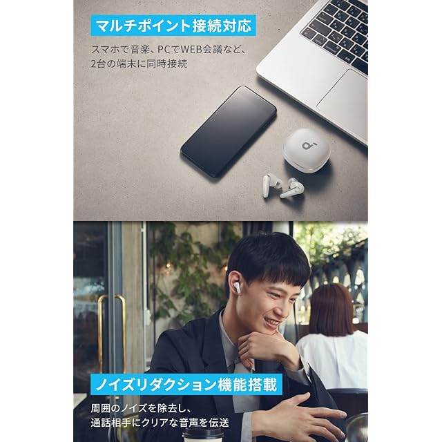 ウルトラノイズキャンセリング 2.0:Anker独自技術のウルトラノイズキャンセリング 2.0により、ノイズキャンセリングの強度を自動で調節します。また、風切り音の低減機能も搭載しています。