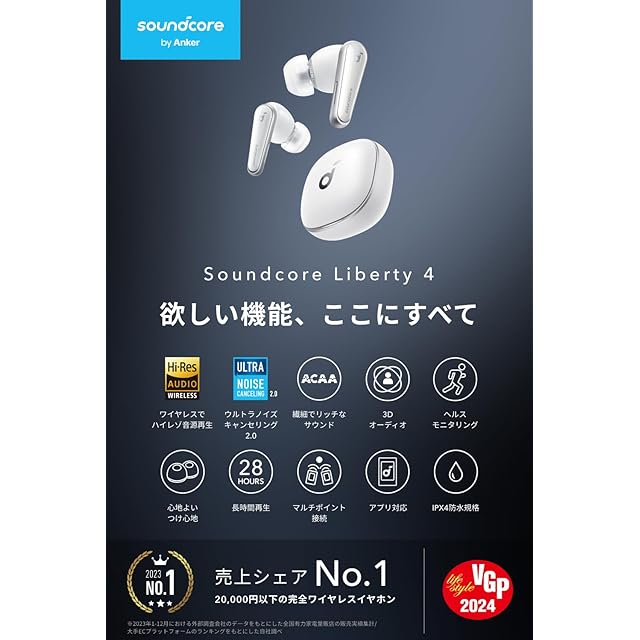商品名:Anker Soundcore Liberty 4(Bluetooth 5.3)【完全ワイヤレスイヤホン/ウルトラノイズキャンセリング 2.0 / 3Dオーディオ / ワイヤレス充電/マルチポイント接続/外音取り込み / 最大28時間再生 / ハイレゾ / IPX4防水規格 / ヘルスモニタリング/PSE技術基準適合】クラウドホワイト