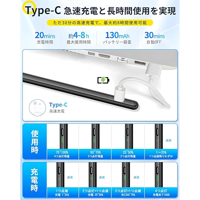 【Bluetooth不要&Type-c充電式タッチペン】このタッチペンは直接に使えて、Bluetoothでペアリングは不要です。ブルートゥースを接続する必要はありません。超便利!スタイラスペンは、Type-c充電式タッチペンです。20分フル充電で8時間継続使用可能となります。突然の停電や長時間の充電を心配する必要はもうありません。 iPadペンシルはType-C充電式で、コンピュータのUSBポート、携帯電話の充電式バッテリー、または充電ヘッドを使用して急速充電できます。このタッチペンは汎用タイプです。不安定な信号や断線は、不安定な電源や角度の使用などに起因する場合がありますので、ご使用前に十分な充電をお試しください。