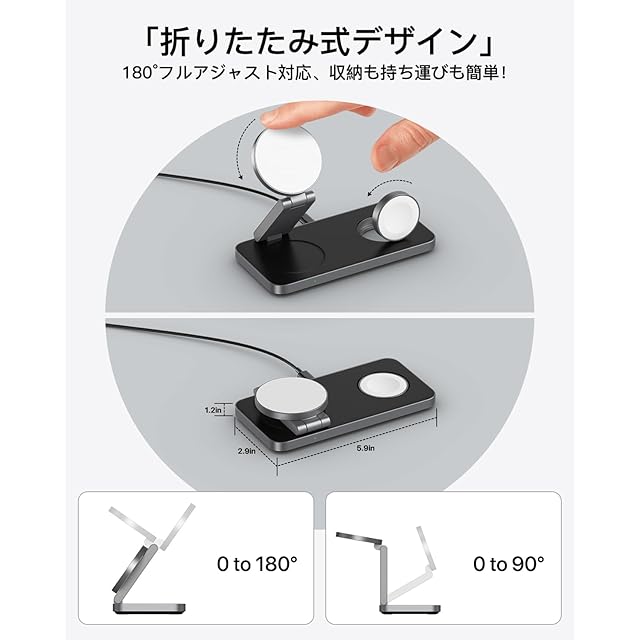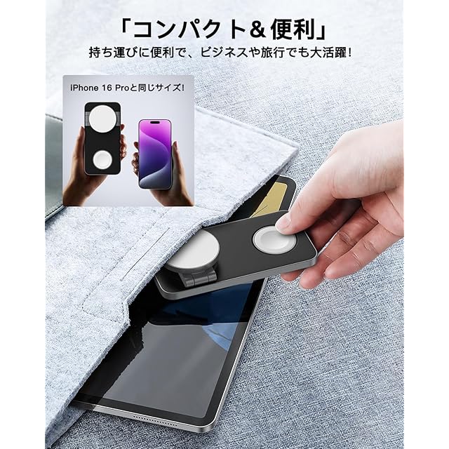 【超コンパクト・折り畳み式】この3in1折りたたみ式マグセーフ充電器は、折りたたんだ状態で長さ15cm、幅7.5cm、厚さ3cmと非常にコンパクトなサイズです。iPhone 16 Proとほぼ同じ大きさで、手のひらやポケットに簡単に収まります。どこへ行くにも便利に持ち運ぶことができ、出張や旅行には必須のアイテムです。
