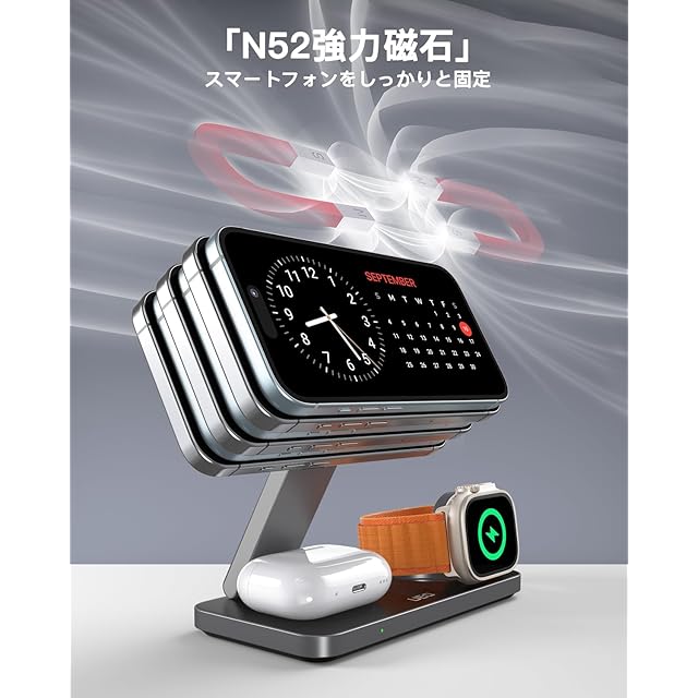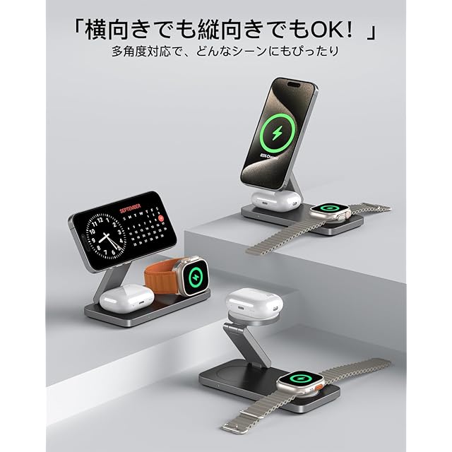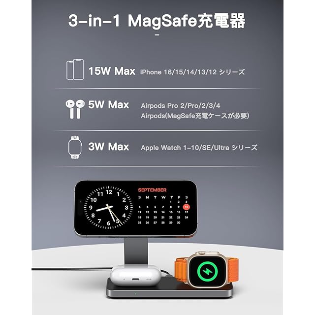 【幅広い互換性】:iPhone 16、iPhone15、iPhone14、iPhone13、iPhone12シリーズ.、他にもQi規格に準拠したデバイスであれば充電可能です。Airpods:AirPods(第2世代)、AirPods(第3世代)、AirPods Pro Apple Watch:Apple Watch ultra/ Series 10/9/8/7/6/5/4/3/2、Apple Watch SE(第1世代・第2世代)、Apple Watch Ultra