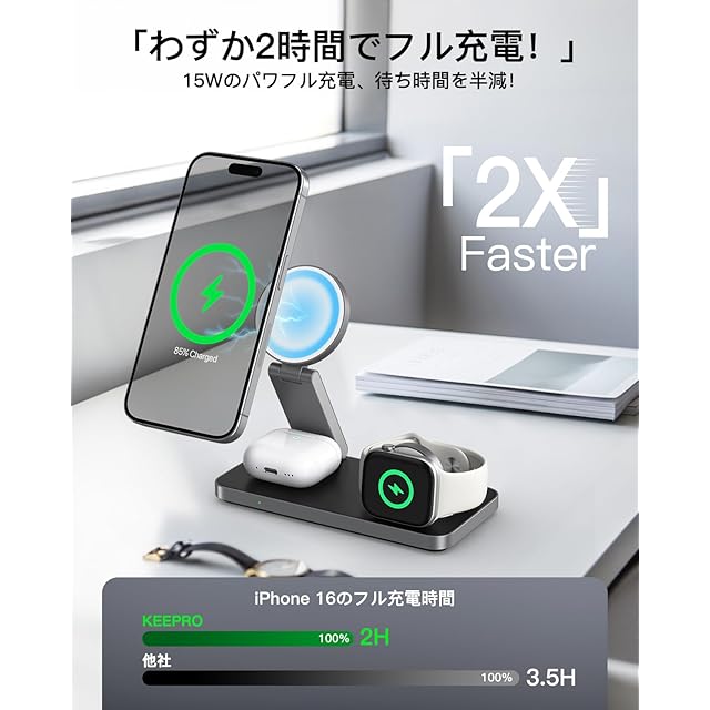 商品名:KEEPRO MagSafe 3in1 ワイヤレス充電スタンド 折りたたみ式 iPhone/Apple Watch/AirPods対応 3デバイス同時充電 15W/10W/7.5W 横向き/縦向き自由調整 強力マグネット固定 ベッドサイド・デスク/旅行両用 コンパクト軽量【20W PD3.0アダプター付属】