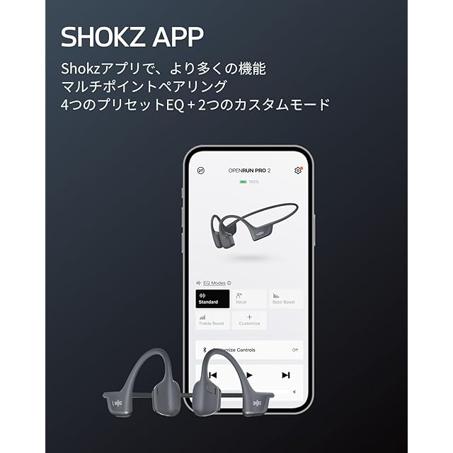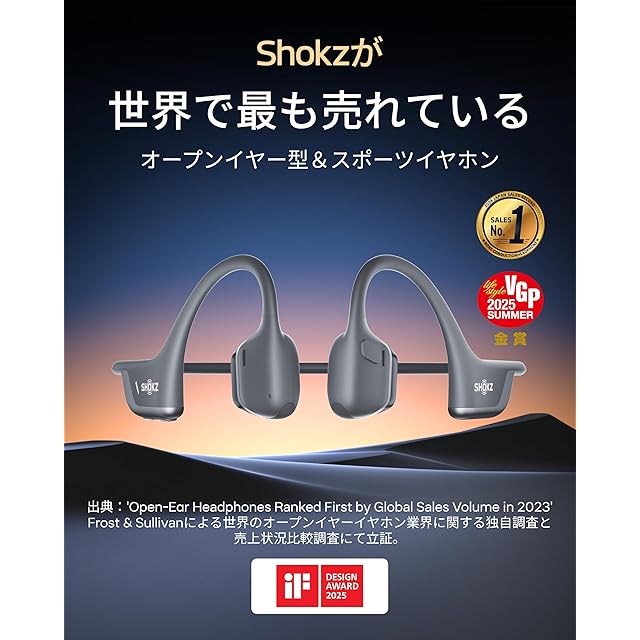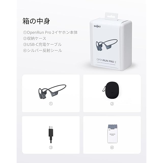 Shokzについて Shokzは、世界的に有名な骨伝導技術を持つオープンイヤーヘッドフォンのリーディングメーカーであり、革新的なデザインと高品質な音響体験を通じて新しいライフスタイルを提案し続けています。 使用シーン Shokzのワイヤレスヘッドフォンは、ウォーキング、通勤、学習、仕事、リモートワーク、会議、スポーツ、ランニング、サイクリング、ヨガ、テニス、ハンズフリー通話、テレコミューティング、ウェブ会議、モバイルゲーム、通勤、リモートワークなど、さまざまなシーンで輝きます。誕生日、新年、クリスマスギフトに最適です。 製品仕様 材料:シリコン、プラスチック、ニッケルチタン合金 Bluetoothバージョン:Bluetooth 5.3 充電時間:60分 1回の充電での使用時間:最大12時間のバッテリー寿命 充電方法:USB Type-C 同梱物 OpenRun Pro 2イヤホン本体*1、収納ケース*1、USB-C充電ケーブル *1、シルバー反射シール *1、書*1、ユーザガイド*1