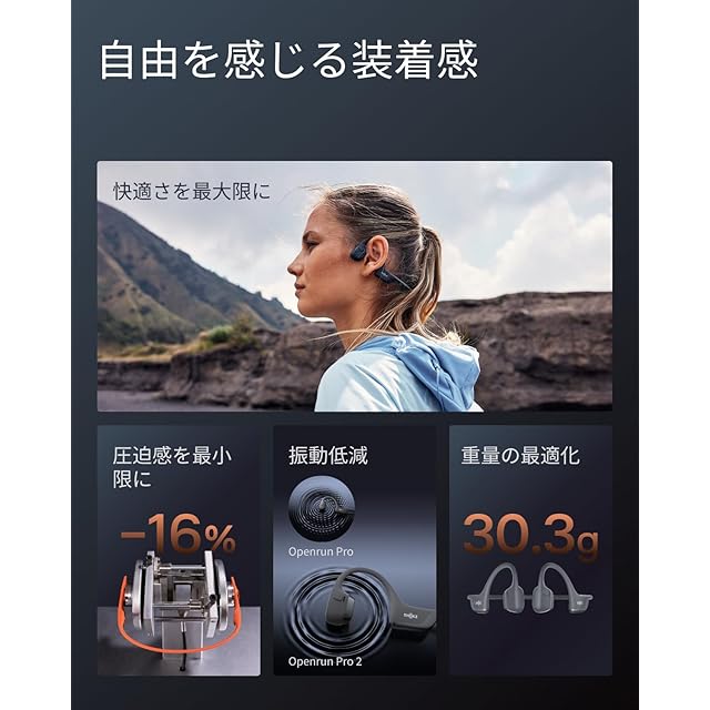 周囲が確認できる安全性:Shokzの特徴的なオープンイヤーデザインを採用したOpenRun Pro 2は、周囲の音をしっかりと把握しながら、ワークアウトに集中することができます。OpenRun Pro 2は音量範囲をインテリジェントに最適化し、外出先でもクリアな音声をお楽しみいただけます。