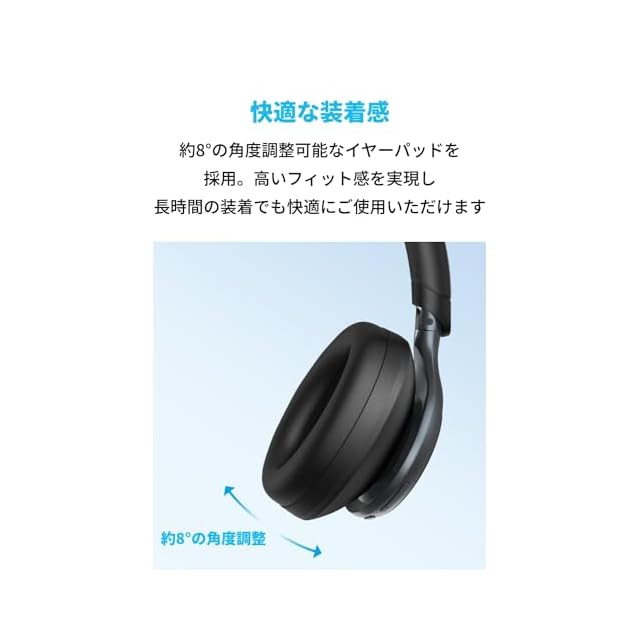快適なフィット感: 約8°の角度調整が可能なイヤーパッドとクッション性の高いヘッドバンドを採用。頭の形に合わせた高いフィット感を実現し、長時間の装着でも快適にご使用いただけます。