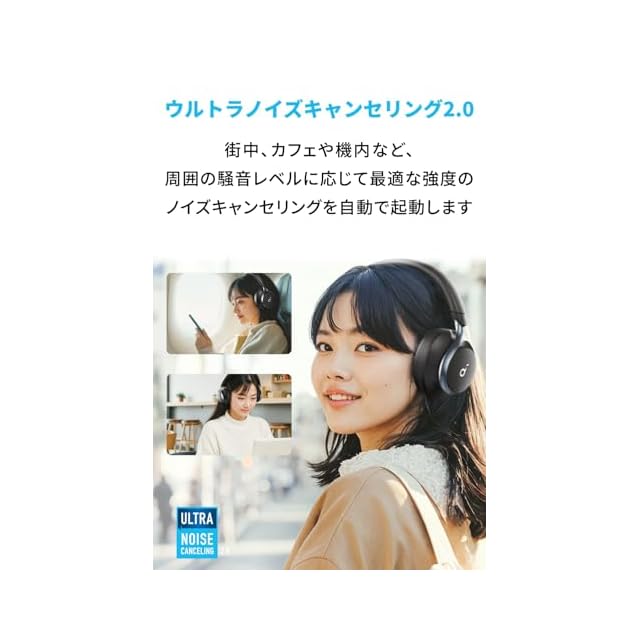 ウルトラノイズキャンセリング2.0:周囲の騒音レベルに応じてノイズキャンセリングの強さを自動で調節します。電車内やカフェなど場所を問わず音楽をお楽しみいただけます。