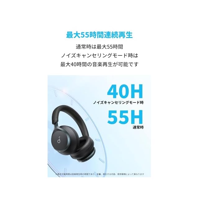 最大55時間の音楽再生: 通常時は最大55時間、ノイズキャンセリングの使用時は最大40時間の音楽再生が可能です(※再生可能時間は音量や使用環境によって異なります)。