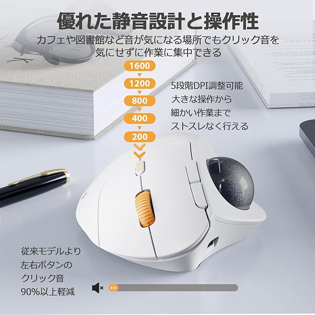 【静かなクリック】このトラックボールはカチカチ音がしない静音スイッチを採用しているため、前モデルより90%以上の操作音を軽減し、オフィスやカフェ、図書館など静かな場所でもクリック音を気にせずに勉強や仕事に集中できます。(※注意: DPI変更ボタン・進む・戻るボタンは静音仕様ではありません)【優れた操球感】光沢仕上げのボールとワイドなボール面は円滑な動きとソフトな感触を提供します。さらに、高密度粒子コーティングが施されており、正確で滑らかなトラッキングを実現しています。これ一台で、想像以上の操球感を楽しめます!