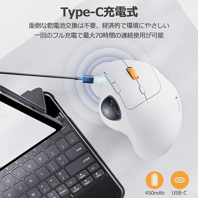 【USB-C充電式・長期間使用可能】面倒な電池交換が不要で、経済的で環境にも優しい充電式トラックボールマウスです。450mAhの大容量バッテリーを内蔵しており、一度のフル充電で最大70時間の連続使用が可能です。また、便利な電池残量表示ランプが付いており、電池切れを心配することなく作業に集中できます。
