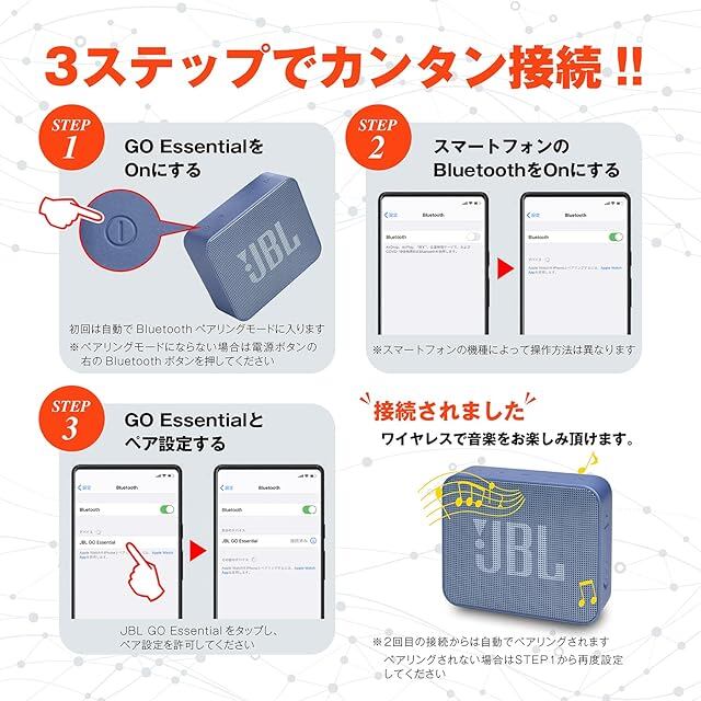 「JBL GO」シリーズは、2015年の初代「JBL GO」発売以来、世界各国で多くのお客様にご愛顧いただき、全世界累計で4,300万台の販売数を誇る大人気のポータブルBluetoothスピーカーシリーズ。その最新モデルである「GO Essential」はアイコニックなロゴを前面にあしらい、ポケッタブルサイズとJBLらしいパワフルなサウンドを両立した最新モデルです。 音質面では、手のひらサイズで177gという、超軽量かつ持ち運びに便利なポケッタブルサイズ設計でありながら、40㎜径フルレンジスピーカー×1基とパッシブラジエータ―を装備。サイズを超えた迫力のあるJBLパワフルサウンドをお楽しみいただけます。 IPX7※防水性能も装備しているので、海辺やプールサイドはもちろん、キッチン周りやお風呂場などでも安心してお使いいただけます。