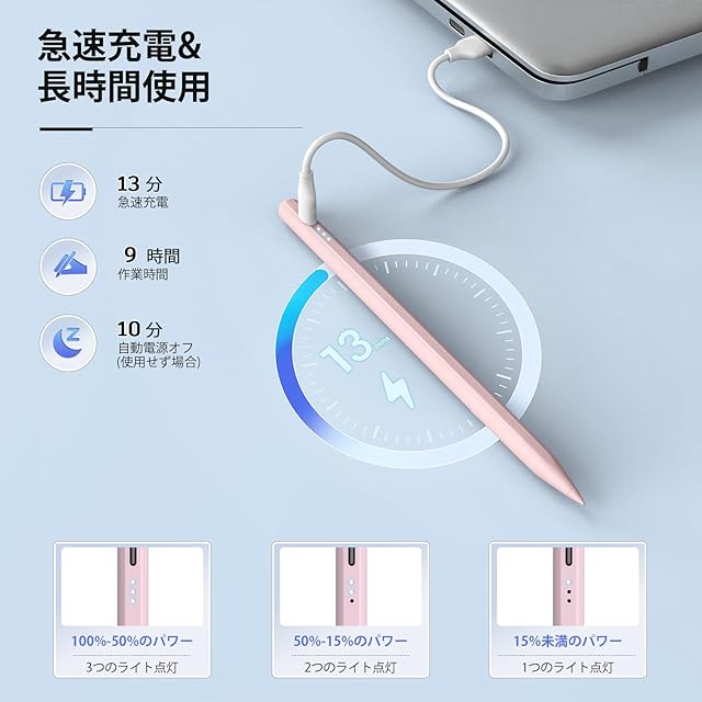 【高速充電&自動スリープデザイン】5V充電器を使用してタイプCケーブルで15分間の充電で、10時間の連続使用が可能です。さらに、iPadペンは10分間の非使用後に自動的に電源がオフになり、電力を節約しバッテリー寿命を延ばします。