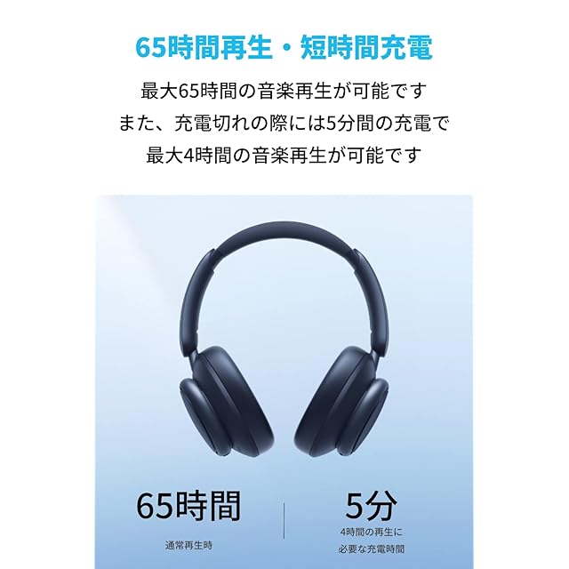 最大65時間再生・短時間充電:最大65時間の音楽再生が可能で、5分間の充電で約4時間の音楽を再生することができます (※再生可能時間は音楽再生時の時間であり、音量や使用環境によって異なります)。