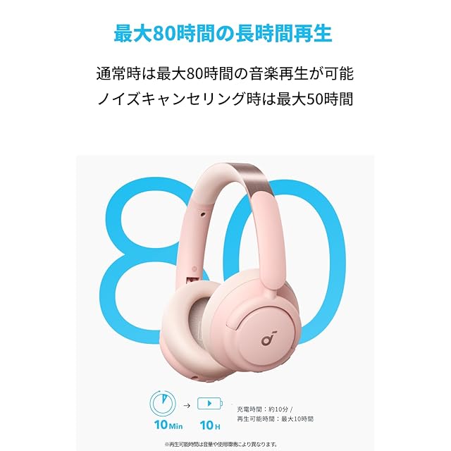 最大80時間の長時間再生:通常時は最大80時間の音楽再生が可能。ノイズキャンセリング時は最大50時間。
