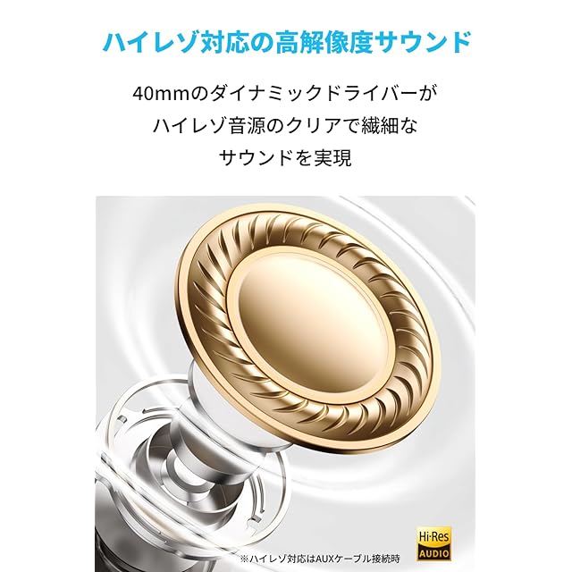 ハイレゾ対応の高解像度サウンド:40mmのダイナミックドライバーが、ハイレゾ音源のクリアで繊細なサウンドを実現。