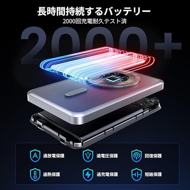 【多重保護&LEDインジケーター搭載・安心して使える設計】高性能NTC温度管理チップを含む8重保護機能(過負荷・過充電・過放電・過電流・過電圧・短絡・逆流防止・温度検知)で、あらゆるトラブルを事前に回避。さらに、4段階のLED残量インジケーター+ワイヤレス充電用インジケーターで「今どれだけ使えるか」がひと目でわかるから、出先でも安心して使えます。