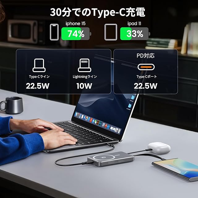 ⚡【22.5W高速有線充電・PD3.0対応のデュアルType-Cポート】本製品はPD3.0対応&最大22.5W出力のType-Cポートと内蔵ケーブルで、スマホもPCもあっという間にフル充電!朝の忙しい時間や緊急時にも、スピードで差がつくパワフルモデルです。もちろん、Type-Cポートは入力・出力どちらも対応で、これ1本で双方向に使えるのも便利。