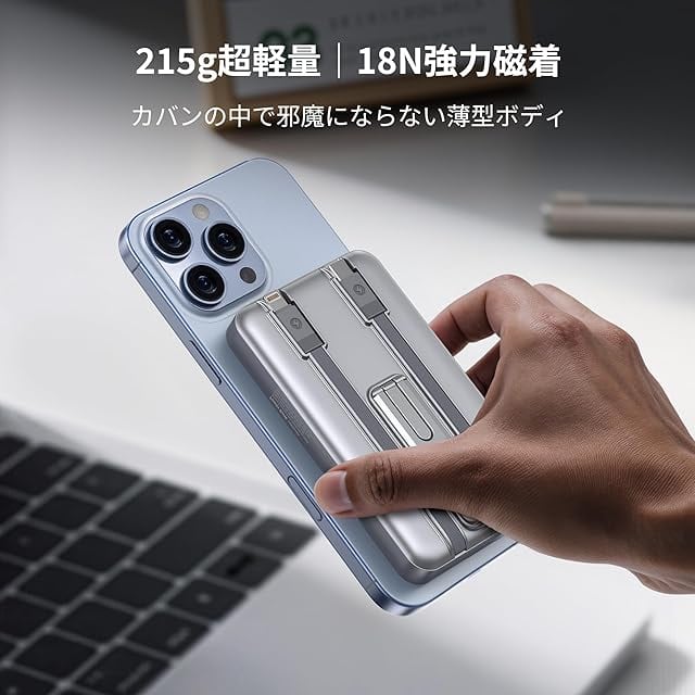 商品名:Magsafe対応モバイルバッテリー 16800mAh 大容量【ケーブル内蔵・4台同時充電】軽量 PD22.5W+15Wワイヤレス急速充電 スタンド付き LED残量表示 Type-C入出力兼用 マグネット式 マグセーフ充電器 iPhone16/15/14/13/12シリーズ対応 コンパクト 小型 機内持ち込み可 旅行/出張/防災 PSE認証済み(シルバー)