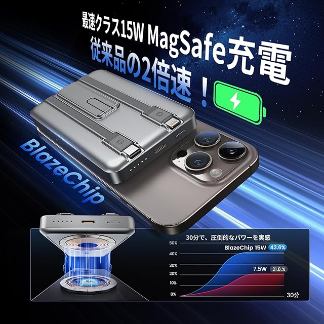 【最大15Wワイヤレス急速充電・MagSafe対応・超強磁力】たったの7.5W出力の「なんちゃって急速充電」とは一線を画す、最大15W出力の本格ワイヤレス充電を搭載。MagSafe対応でiPhone 12〜16シリーズにピタッと吸着、わざわざケーブルを探す手間もゼロ。磁力は非常に強く、バッテリーだけを持ってもスマホが落ちないほどの吸着力を実現。※MagSafe非対応ケースをご使用の場合、磁力が弱くなる可能性があります。