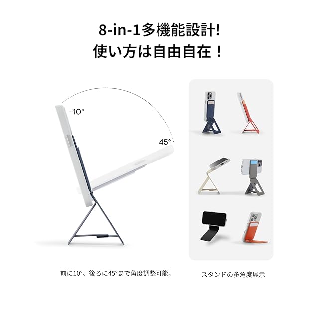 【カードケース追加!全てを1台に】MOFTの超人気「七変化マルチスタンド」をベースに、カード収納スペースを新たに追加し、「8-in-1多機能スタンド」が誕生。Makuakeでは1800人以上のご支援をいただき、多くの方からご好評をいただきました。コンパクトながら多機能で、洗練されたデザインも魅力。このMagSafeカードケースは手に馴染みやすく、どこへ行くにも気軽に持ち運べるので、より快適なスマホライフをお楽しみいただけます。
