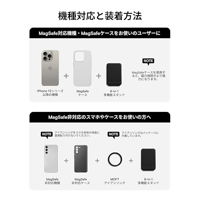 【アイアンリング付き・全機種対応】この携帯スタンドは iPhone 16/15/14/13/12シリーズ(Pro/Pro Max/Plus/Mini含む)に対応。。背面にマグネットが付いていないスマートフォンも、付属のアイアンリングをスマートフォンケースに取り付けるだけで、MOFT 8-in-1多機能スタンドを使用できます。 製品にはマグネットリングが付属しています。取り付け方法については、詳細ページの動画をご参照ください。【注意:粘着面がある側はスマホケースまたはスマホの背面に貼り付けてください。スタンドには貼り付けないでください。】