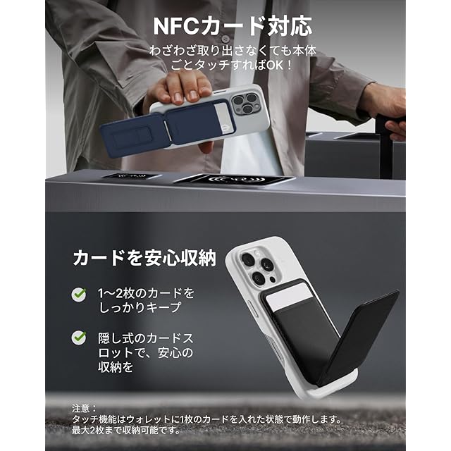 【NFCカード対応!かざすだけでアクセス】マイナンバーカードや運転免許はもちろん、お札や名刺、Suicaなどの交通系ICカードやタッチ決済に対応したクレジットカード、カードキーまで収納可能。カバンから取り出す手間なく、本体ごとタッチするだけでスムーズな決済が可能です。カードケースには1~2枚のカードまで収納できますが、NFC機能を使用するためには、カードを1枚だけ入れてください