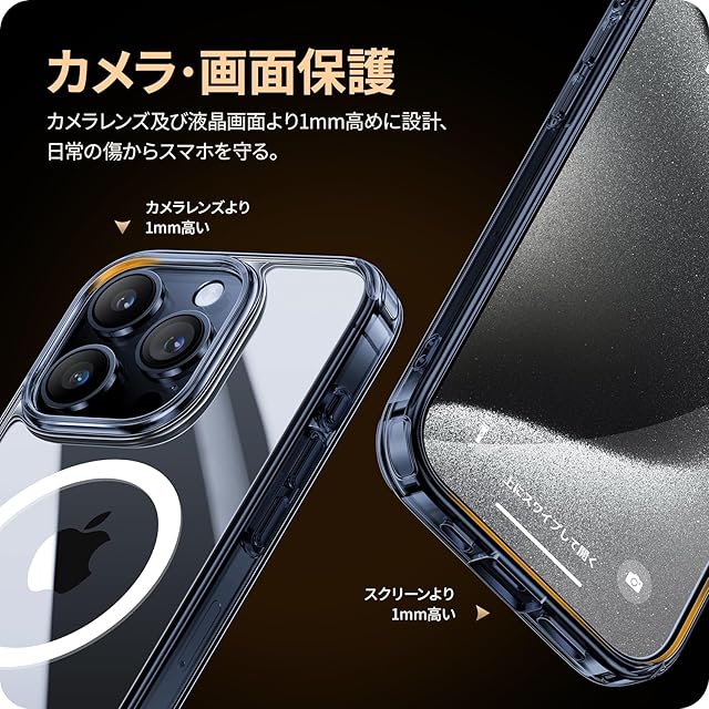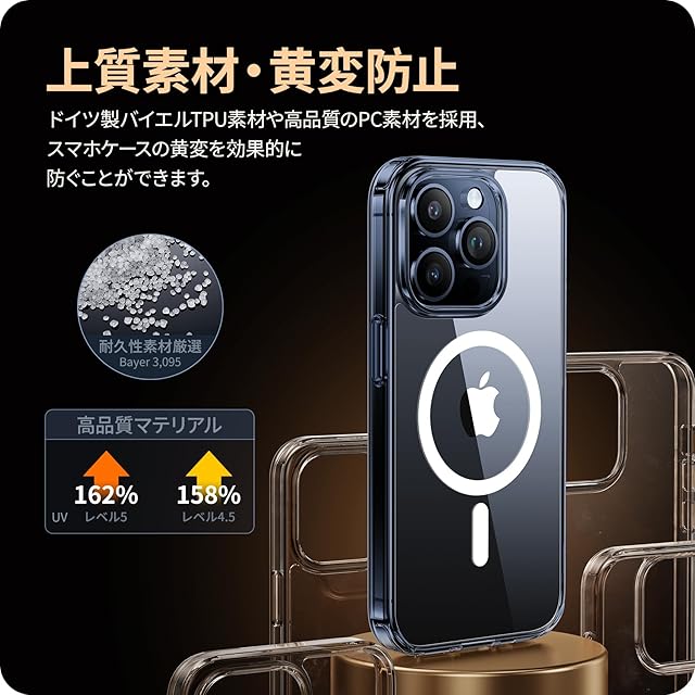 【驚くほどの透明度・黄変防止強化】背面は高透明度ポリカーボネートの素材で、スマホ本来の崇高な美しさと色をそのままに生かし、本体の高級感にも劣らない美しさです。ドイツ製バイエルTPU素材や高品質のPC素材を採用、TPU高分子にUV剤を添加し、黄変防止レベルは4.5級を獲得。スマホを長時間使用しても光沢感、透明感を保つことができます!
