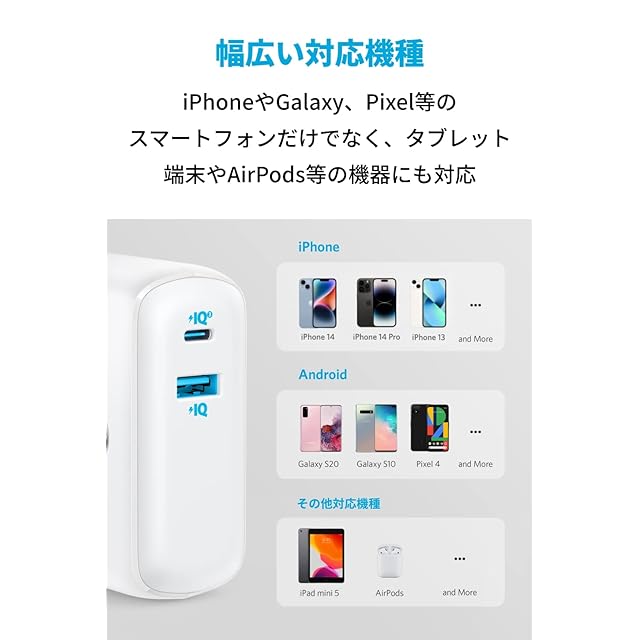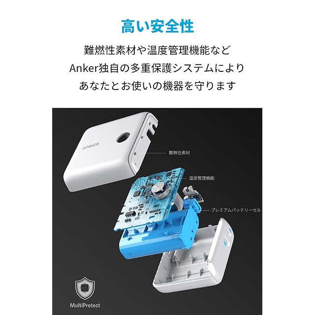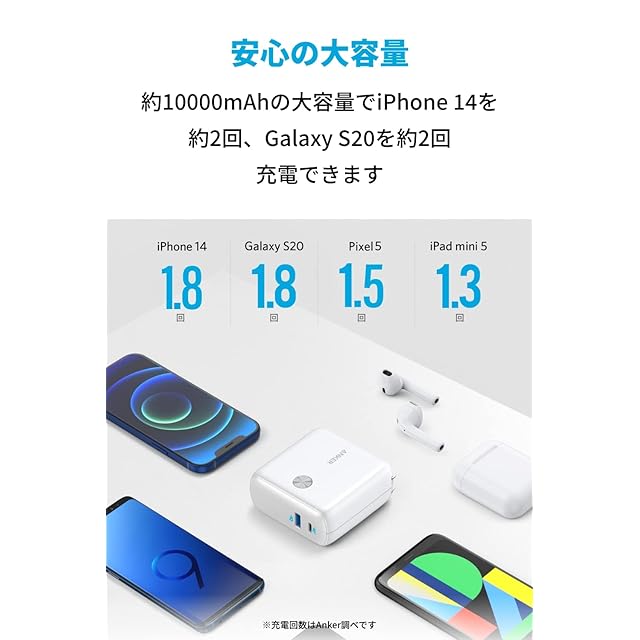 安心の大容量:モバイルバッテリー&充電器一体型モデルでは最大クラスの約10000mAhの大容量で、iPhone 14に約2回、iPad mini 5に約1.3回、その他ほとんどのスマートフォンに複数回、満充電することができます (※充電回数はAnker調べです) 。