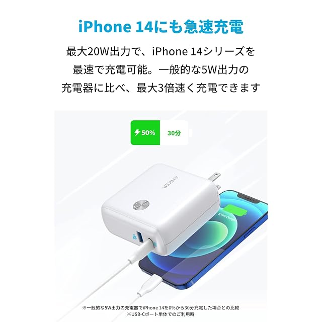 iPhone 14にも急速充電:最大20W出力で、iPhone 14シリーズを最速で充電可能です。一般的な5W出力の充電器に比べ、最大3倍速く充電できます。(※iPhone 14を0%から30分充電した場合との比較)