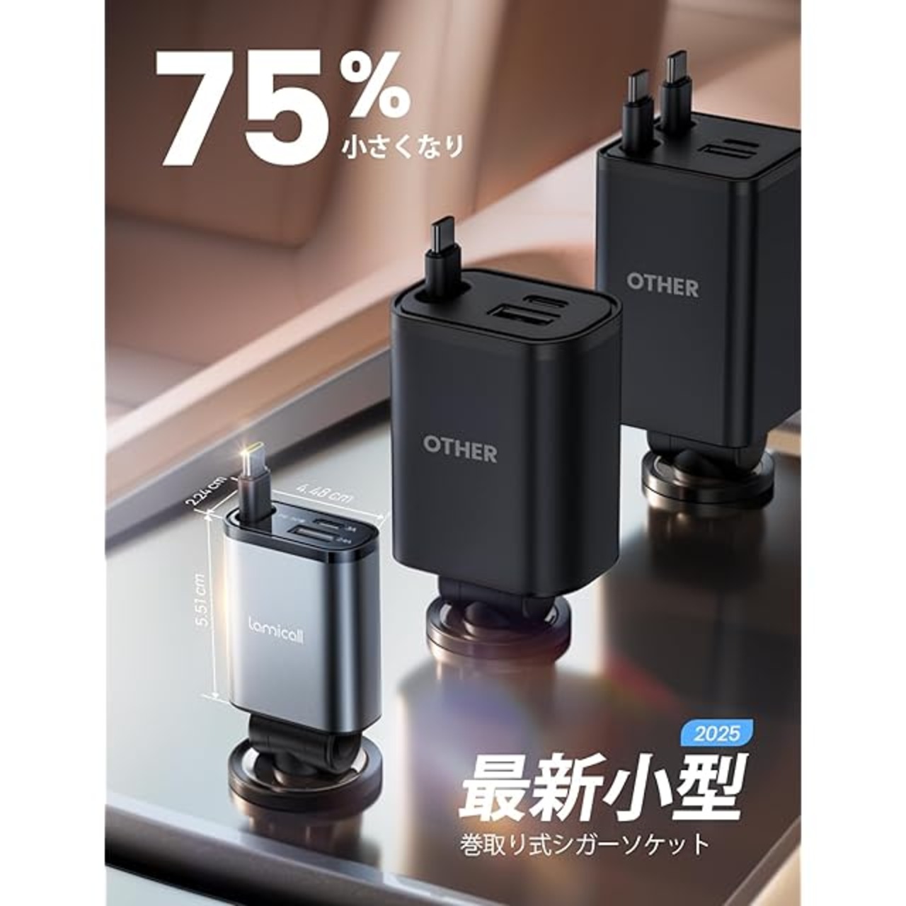 <p>【2025超小型巻取り式】Lamicall シガーソケット 車 充電器:57W 急速 3in1 車載充電器 12/24V車対応 3台同時可能 75cm Type-C ケーブル iPhone16/15シリーズ iPad/android/Apple Watch対応 カーチャージャー 高温/電流保護 旅行 出張 グレー anker アンカー</p> <p>【2025最小型】最新小型巻き取り式シガーソケットは手のひらサイズで(13cmx2.24cmx4.48cm)、トレンドカラーを採用しています。車内のインテリアにぴったり合わせられるので、高級感がありながらも違和感がありません。特に小型車も車内をすっきりします。</p> <p>【巻き取り式・首振り】75CMの自動巻き取り式ケーブルはゴチャゴチャした車内空間と厄介なケーブルのもつれにさよなら、爽やかな運転気分を与えます。収納Tips:ゆっくり1cmぐらい引き出すと、スムーズに自動巻き取れます。さらに、本車載充電器は180度の首振りができますし、運転に邪魔しなく角度を自由に調節できます。</p> <p>⚡【合計57W急速充電・3台同時】弊社のシガーソケットは巻き取り式ケーブル(Type-C:PD30W)+USB-C(QC15W)+USB-A(QC12W)で合計57Wの3ポートが搭載されました。巻き取りType-CケーブルはPD30W/BC1.2/SAMSUNG 2.0A/PPS/ PD3.0に対応し、30W急速充電可能です。特に3台同時充電ができます。多人数同行の時に誰でも満充電のデバイスを持て、残量不足の心配なし、いつでも安心して出発できます!特に出張と長距離のドライブに不可欠な車載用品でしょう。</p> <p>✔【安全保護チップ】本急速カーチャージャーは運転の安全面にもこだわっており、急速充電チップだけでなく、高温・電流・電圧の3重保護機能を搭載したチップを採用しました。短距離の外出でもスマホを素早く復活させます。バッテリ切れを恐れず充電が続けますので短距離や長距離の旅にとても役立ちます。</p> <p>【対応車&機種】弊社は十分な市場調査に基づき、製品を改良しました。本シガーソケットは市場のほとんどのDC12/24V車種に対応可能です。付属のType-Cケーブルは近年発売された多くの機種に30W充電が可能です。対応機種:iPhone16/iPhone15シリーズ,MacBook/Apple Watch,Huawei/Samsung Galaxy/VIVO/OPPO/Pixel,XiaoMi6/8/9/Pro,Mix2S/Mix3,Redmi 10X/Redmi K20 PRO/K30。USB-CとUSB-Aもほか充電ポートのニーズに満たします。例:iPhone14シリーズまたはiPhone14以前の機種にも最大15Wの急速充電ができます。</p> <p>【日本語対応!一年間メーカー】❗❗巻取りケーブル:75cm ❗❗対応車種:DC12V/24V車❗❗サイズ:13cmx2.24cmx4.48cm、重さ:82g❗❗出力:巻き取りType-Cケーブル:30W(PD 5V/3A、9V/3A、12V/2.5A)、USB-A:12W(5V/2.4A)、USB-C:15W(5V/3A)ご購入した日より一年間メーカーサービスを提供いたします。万が一初期不良が発生した場合は、連絡先:アカウントサービス内の「アカウントサービス」→「注文履歴」→「LomicallDirect」→「質問する」或いは説明書に記載されている他の連絡先に、お問合せ下さい。</p> anker シガーソケット アンカー シガーソケット anker アンカー