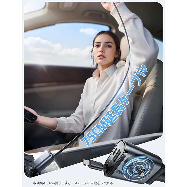【巻き取り式・首振り】75CMの自動巻き取り式ケーブルはゴチャゴチャした車内空間と厄介なケーブルのもつれにさよなら、爽やかな運転気分を与えます。収納Tips:ゆっくり1cmぐらい引き出すと、スムーズに自動巻き取れます。さらに、本車載充電器は180度の首振りができますし、運転に邪魔しなく角度を自由に調節できます。