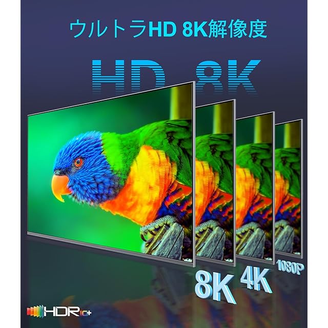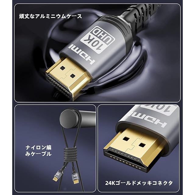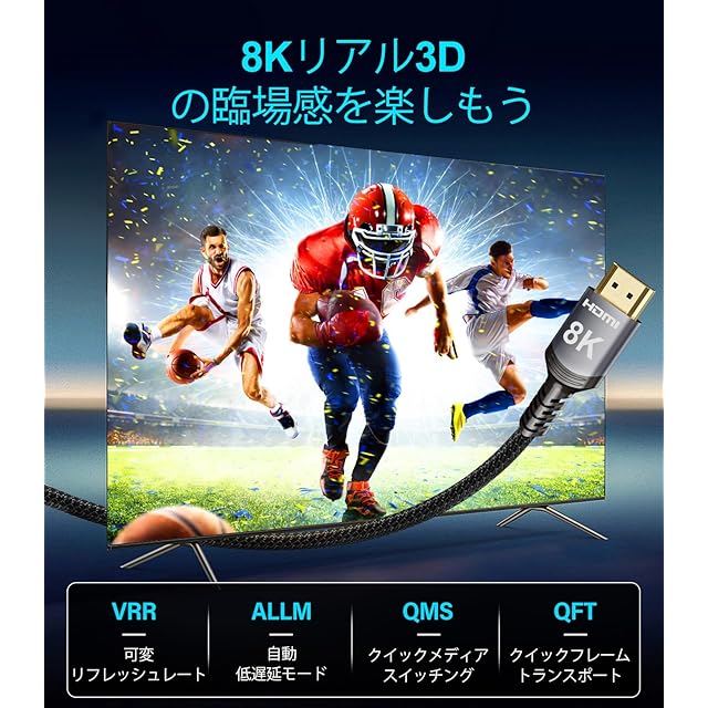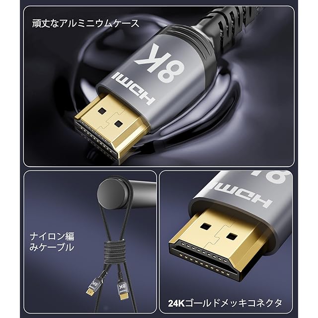 Real 8K HDMI 2.1ケーブル:この8K HDMIケーブルは8K@60Hzおよび4K@240Hzの高解像度を提供し、4K@60Hzの4倍の鮮明さを実現します。先進技術により、映像の明瞭度とシャープさが飛躍的に向上します。 48Gbps超高速ケーブル:48Gbpsの帯域幅を持つHDMI 2.1ケーブルは、圧縮されていない8K(7680×4320)映像を信号損失なしで高速伝送します。HDMI 2.0(18Gbps)より2.6倍速く、4K@240Hzにも対応。可変リフレッシュレートとQFTにより表示遅延を低減。映画やビデオの自動低遅延モードと高速メディア切替により、HDMIソースデバイスが映像モードを切り替える際のブラックアウトをHDMI VRR機構が解消します。 Dynamic HDR & eARC:このHDMIケーブルはDynamic HDRに対応しており、12ビットの色精度で細部まで捉え、息をのむようなリアルな映像を実現します。eARC(拡張オーディオリターンチャンネル)機能により、Dolby AtmosやDTS:Xなどの高解像度音声をテレビからサウンドバーやAVレシーバーへ直接伝送可能。さらにHDCP 2.3/2.2、イーサネット、3Dにも対応しています。 先進技術 10K 8K@60Hz:この超高速HDMIケーブルは、驚異の10K 8K@60Hzおよび4K@120Hzの表示性能を提供。Dynamic HDRと12ビットカラー処理により、画面のすべてのフレームで比類なき奥行き、輝度、ディテールを実現し、息をのむような映像体験をします。 強化された耐久性:頑丈なアルミ合金ケース、ニッケルメッキコネクタ、耐久性に優れたナイロン編組ジャケットで構成されており、頻繁な屈曲テストにも耐え、ケーブルの柔軟性を保ちながら断線を防止。信号伝送性能の向上と長寿命を実現します。 超高速パフォーマンス:48Gbpsの帯域幅により、8K映像を高速かつ無損失で伝送。4K@120Hzや可変リフレッシュレート、Quick Frame Transportにも対応し、遅延を抑えた高負荷のゲームや映画視聴に最適。すべてのHDMIバージョンに対応。 幅広い互換性:Apple TV、PS5、PS4 Pro、Roku Stick、Xbox Series X/S、Xbox 360、Nintendo Switch、Wii U、Mac mini M4/M4 Pro、ノートパソコン、PC、Blu-rayプレーヤー、AVレシーバー、TVスティック、TVボックス、DVDプレーヤー、LG 8K UHDテレビ、Samsung G8/G9 QLEDテレビ、サウンドバー、プロジェクター、モニターなど多くのデバイスと互換性があります。 Dynamic HDRと優れた音質:Dynamic HDRにより、12ビットカラー精度で色の幅と細部をより豊かに表現し、リアルな映像を実現。eARC(拡張オーディオリターンチャンネル)により、テレビからサウンドバーやレシーバーに高音質な音声を直接伝送し、DTS:Xなどの高度な音声フォーマットに対応します。 優れた耐久性と構造:頑丈なアルミ合金ケースとニッケルメッキコネクタを備え、耐久性の高いナイロン編組ジャケットで構成されています。軍用グレードの引張素材と強化された折り曲げ防止設計により、長寿命と安定した性能を実現します。 広範な互換性:PS5、Roku TV、HDTV、ノートパソコン、PC、サウンドバー、プロジェクター、モニターなど、さまざまなデバイスに対応。ゲーム、ストリーミング、ホームシアターのすべてに対応する柔軟かつ将来性のある接続を実現します。