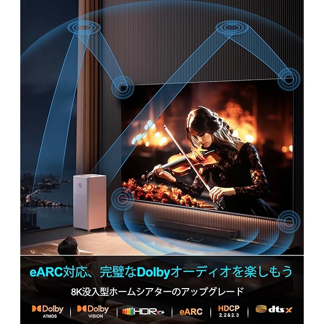 HDMIダイナミックHDR&高音質対応: ダイナミックHDRにより、12ビットカラー精度でより細部までリアルに再現。驚くほどリアルな映像体験を実現します。eARC(拡張オーディオリターンチャンネル)機能で、Dolby AtmosやDTS:Xなどの高解像度音声をテレビからサウンドバー/AVレシーバーへ直接転送可能。HDCP 2.3/2.2、イーサネット、3Dにも対応。