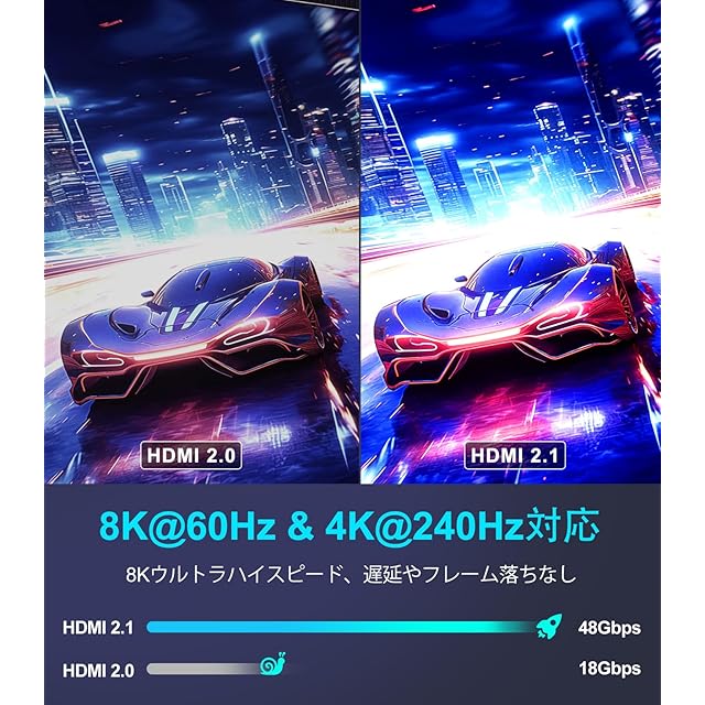 48Gbps超高速HDMIケーブル: このHDMI 2.1ケーブルは、48Gbpsの帯域幅で8K(7680×4320)の非圧縮映像を信号劣化なしで高速伝送。HDMI 2.0(18Gbps)よりも約2.6倍高速。4K@240Hz、可変リフレッシュレート(VRR)およびQFT(クイック・フレーム・トランスポート)をサポートし、表示遅延を軽減。ALLM(自動低遅延モード)とQMS(クイックメディアスイッチング)で暗転なしの快適な切り替えを実現。