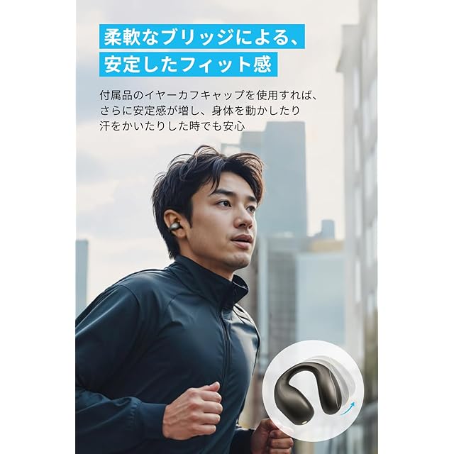 装着しやすい柔軟なブリッジによる、安定したフィット感: 付属品のイヤーカフキャップを使用すれば、さらに安定感が増し、身体を動かしたり汗をかいたりした時でも安心。