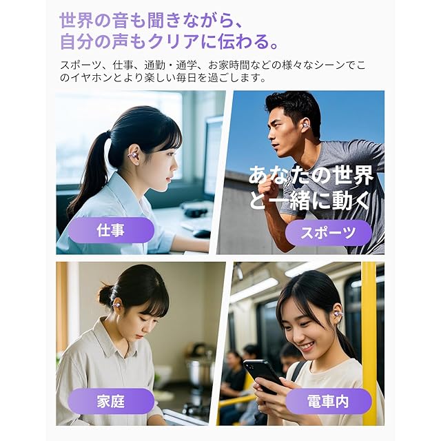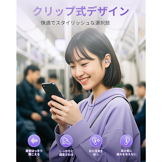 商品名:「2024年超快適 音質強化モデル イヤーカフ」イヤホン bluetooth5.4 ワイヤレスイヤホン Hi-Fi音質 音漏れ抑制 オープンイヤー型 耳を塞がない 軽量約5.6g ENC通話ノイズキャンセリング ながら聴き 耳挟み式 骨伝導の革新 人間工学設計 IPX5防水 マイク付き iOS/Android対応 通勤/通学/スポーツ/ゲーム (パープル)