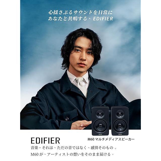 EDIFIER M60は、高解像度オーディオ再生用に設計されたコンパクトなデスクトップスピーカーです。優れた出力とスタイリッシュなデザインで、さまざまなデスクレイアウトに適しています。 コンパクトデザイン:M60は、幅100mm x 高さ168mm x 奥行147mmのサイズで、どんな空間にもシームレスにフィットします。 パワフルな出力:66W RMSの総出力を誇り、コンパクトなサイズにもかかわらず力強いサウンドを提供します。 高品質なサウンド:Hi-Res AudioおよびHi-Res Audio Wirelessの認証を受けており、最高品質のサウンドをします。 エレガントなデザイン:シンプルなデザインで、どんなデスクトップスタイルにも合致します。