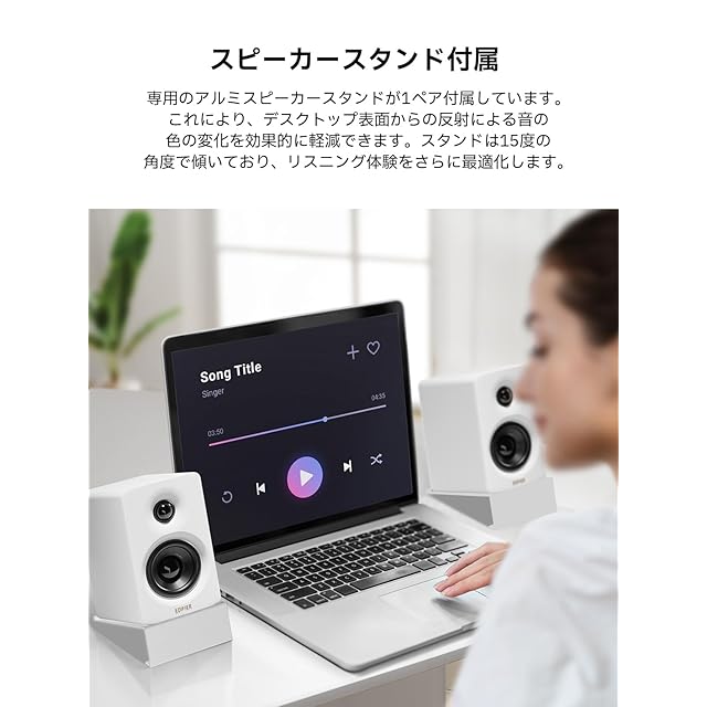 【スピーカースタンド付属】M60には専用のアルミスピーカースタンドが1ペア付属しています。これにより、デスクトップ表面からの反射による音の色の変化を効果的に軽減できます。スタンドは15度の角度で傾いており、リスニング体験をさらに最適化します。