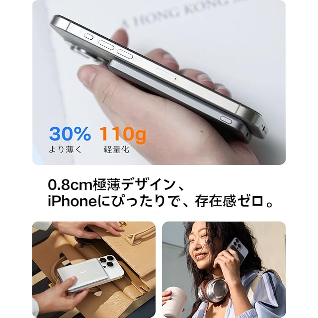 【極薄デザイン、驚きの携帯性】iPhone専用「MiniMag」は、業界極薄の0.8cmのアルミボディに5000mAh大容量を凝縮しています。重さわずか111gで、iPhoneにくっつけても違和感ゼロ。ビジネスバッグもスリムポケットもすっきり収まります。さらに、薄型で軽量なのに性能はプロ級!バッテリー容量やパフォーマンスを犠牲にせずに、外出先でもスマホの充電をしっかりサポートします。