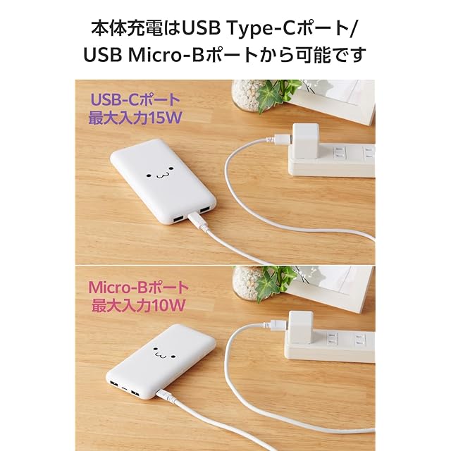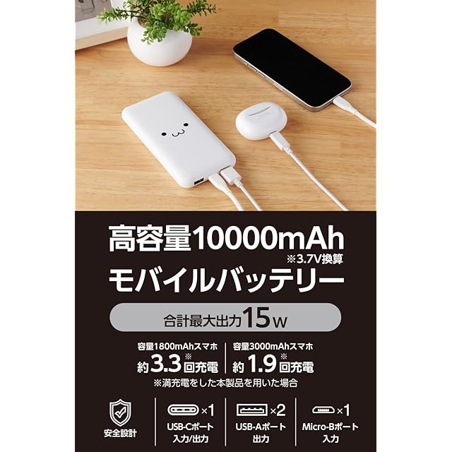 商品名:エレコム モバイルバッテリー 10000mAh 15W 3ポート Type-C×1 USB-A×2 microB(入力専用) 機内持ち込み可 PSE技術基準適合 しろちゃん(ホワイト×ブラック) EC-C37WF